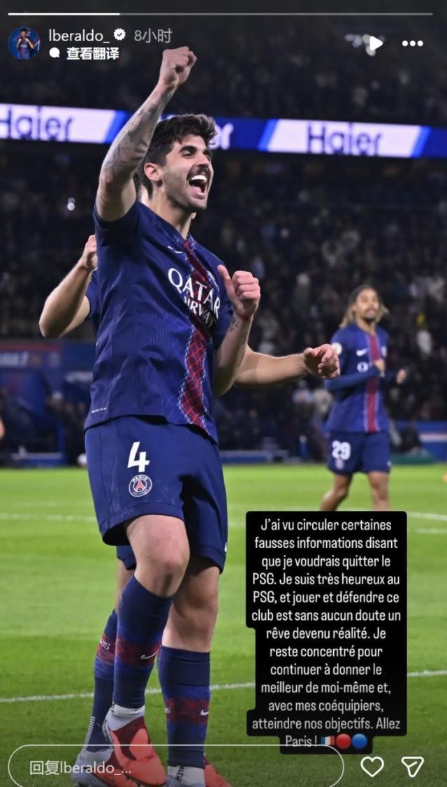 11月1日讯 巴黎后卫贝拉尔多更新社媒动态,辟谣离队传闻。贝拉尔多社媒晒出身穿巴黎球衣庆祝的照片,配文:“我看到一些不实消息称我想离开巴黎圣日耳曼。我在巴黎圣日耳曼非常开心,为这家俱乐部效力对我来说无疑是梦想成真。”“我将继续专注于发挥最佳水平,与队友们共同实现我们的目标。加油巴黎!”